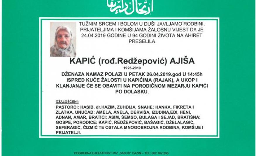 Na Ahiret preselila Kapić (rođ Redžepović) Ajiša