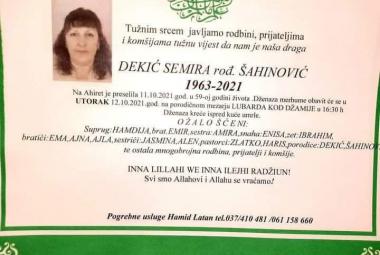 Na ahiret preselila Dekić Semira rođ. Šahinović