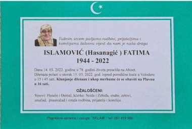 Na Ahiret preselila Islamović (Hasanagić) Fatima