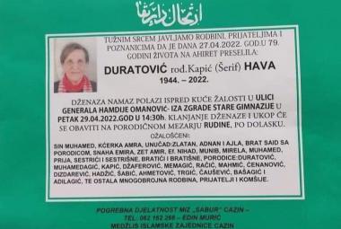 Na Ahiret preselila Duratović rođ. Kapić (Šerif) Hava