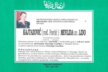 Na Ahiret preselila Kajtazović (rođ. Porčić) Mevlida zv. Lido