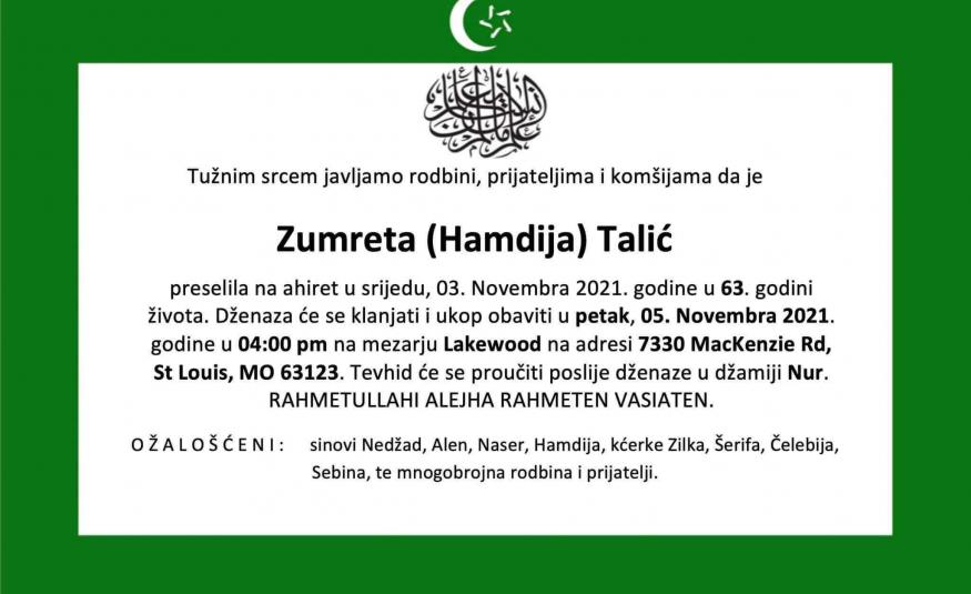 Na ahiret preselila Zumreta (Hamdija) Talić