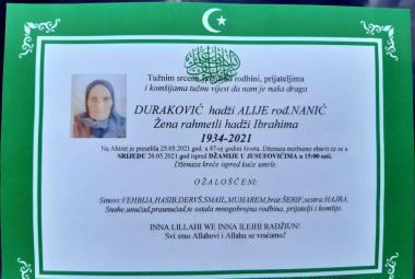 Na ahiret preselila Duraković hadži Alije rođ. Nanić