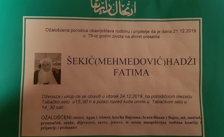 Na Ahiret preselila Šekić (Mehmedović) hadži Fatima