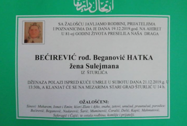 Na Ahiret preselila Bećirević (rođ. Beganović) Hatka