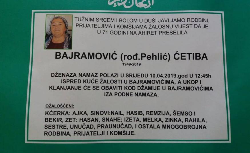Na Ahiret preselila Bajramović (rođ.Pehlić) Ćetiba