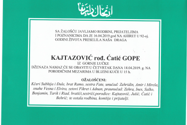 Na Ahiret preselila Kajtazović (rođ.Ćatić) Gope