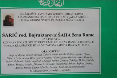 Na Ahiret preselila Šarić rođ. Bajraktarević Šaha, žena Rame
