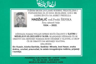 Na Ahiret preselila Hadžalić (rođ. Prošić) Šefika