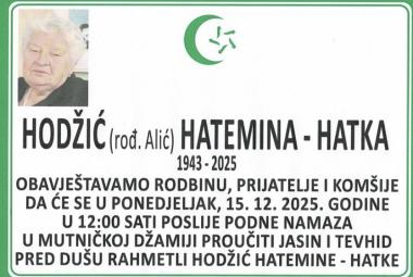 Na Ahiret preselila Hodžić (rođ. Alić) Hatemina – Hatka