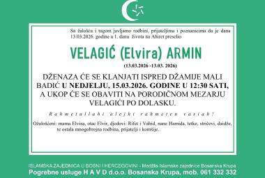Tuga. U 1. godini života na Ahiret preselio VELAGIĆ (Elvira) ARMIN