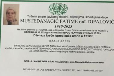 Na Ahiret preselila MUSTEDANAGIĆ FATIME rođ. TOPALOVIĆ