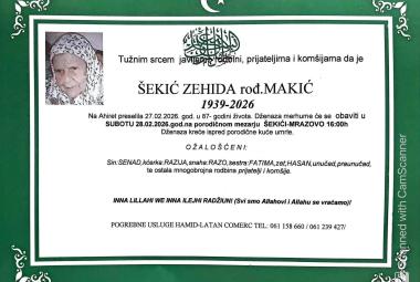 Na Ahiret preselila ŠEKIĆ ZEHIDA rođ. MAKIĆ 1939–2026