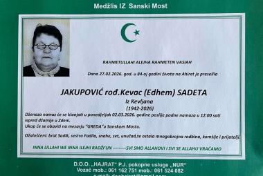 Na Ahiret preselila Jakupović, rođ. Kevac (Edhem) Sadeta