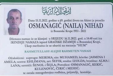 Na Ahiret preselio Osmanagić (Naila) Nihad
