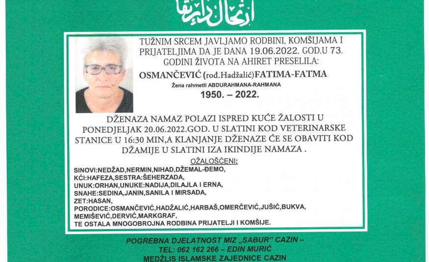Na Ahiret preselila Osmančević (rođ. Hadžalić) Fatima - Fatma