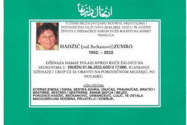 Na Ahiret preselila Hadžić (rođ. Bećkanović) Zumro
