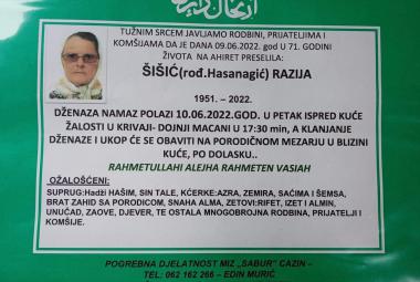 Na Ahiret preselila Šišić (rođ. Hasanagić) Razija
