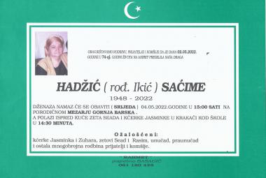 Na Ahiret preselila Hadžić (rođ. Ikić) Saćime