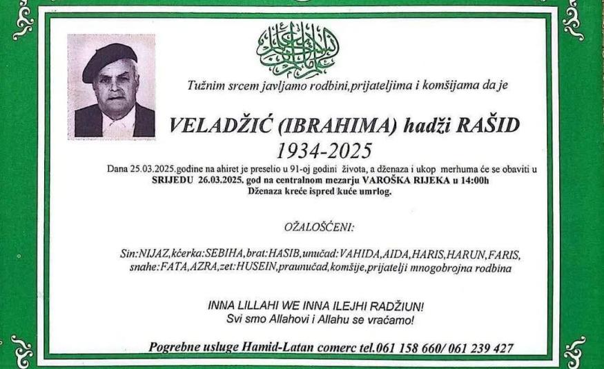 Na ahiret preselio VELADŽIĆ (IBRAHIMA) hadži RAŠID