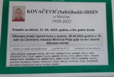 Na Ahiret preselio Kovačević (Safet) hadži-Irdin