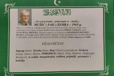 Na ahiret preselila MUŠIĆ (Felić) ZEHRA