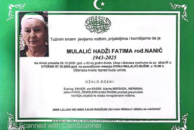 Na ahiret preselila MULALIĆ HADŽI FATIMA rođ. NANIĆ
