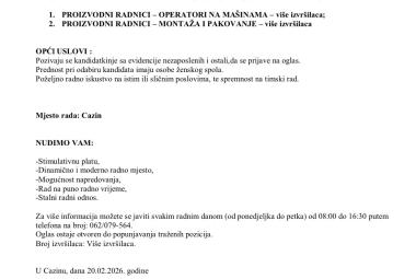 Oglas za prijem radnika u Cazinu