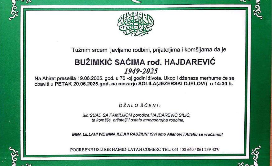 Na Ahiret preselila Bužimkić Saćima rođ. Hajdarević