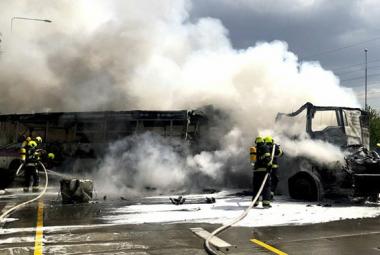 Autobus se zapalio nakon sudara s kamionima, jedna osoba poginula