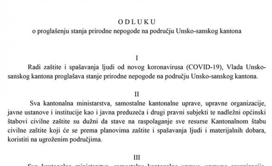 Proglašeno stanje prirodne nepogode na području Unsko-sanskog kantona