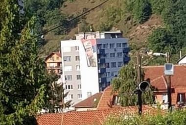 Pano sa likom ratnog zločinca Ratka Mladića postavljen na zgradu u Foči