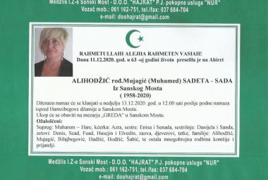 Na Ahiret preselila Alihodžić (rođ. Mujagić) Sadeta - Sada