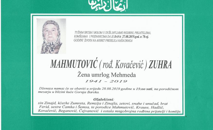 Na Ahiret preselila Mahmutović (rođ. Kovačević) Zuhra