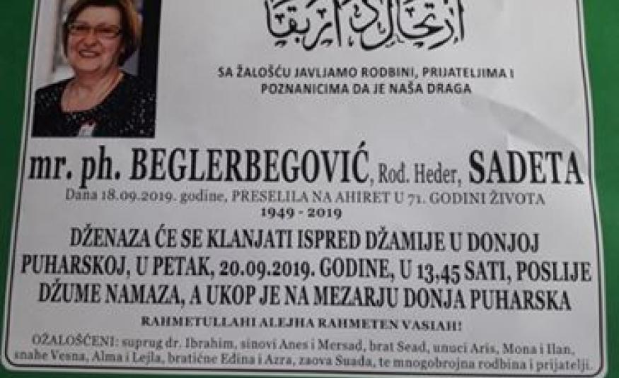 Na Ahiret preselila Beglerbegović (Heder) Sadeta