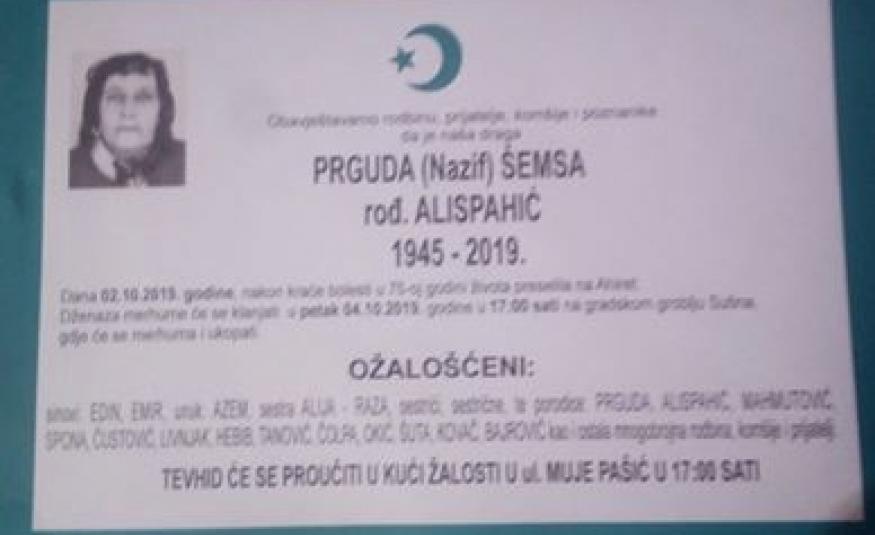 Na Ahiret preselila Prguda (Nazif) Šemsa rođ. Alispahić