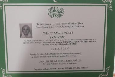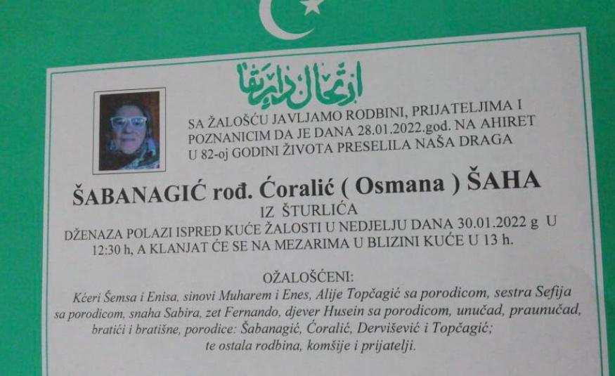 Na Ahiret preselila Šabanagić rođ. Ćoralić (Osmana) Šaha