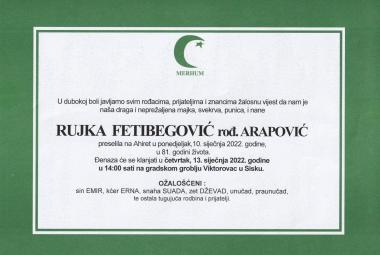 Na Ahiret preselila Rujka (rođ. Arapović) Fetibegović