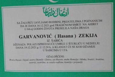 Na Ahiret preselila Garvanović (Hasana) Zekija