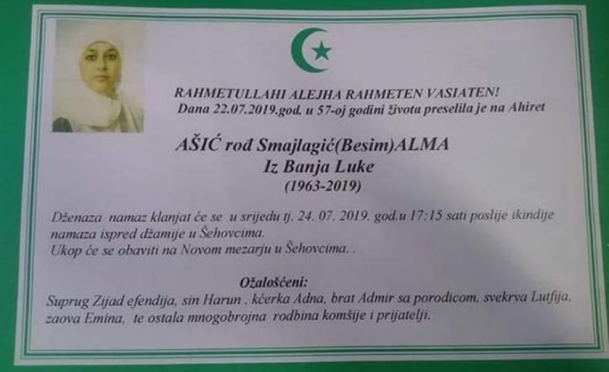 Na Ahiret preselila Ašić ( rođena Smajlagić) (Besim) Alma