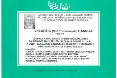 Na Ahiret preselila Veladžić (Rođ. Toromanović) Hasnija