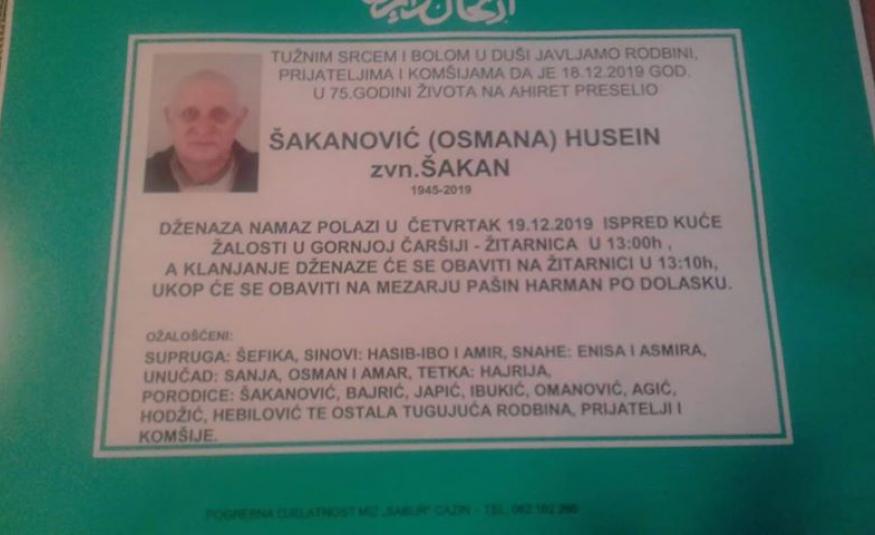 Na Ahiret preselio Šakanović (Osmana) Husein zvani Šakan