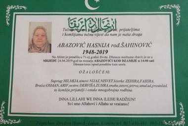 Na Ahiret preselila Abazović (rođ. Šahinović) Hasnija