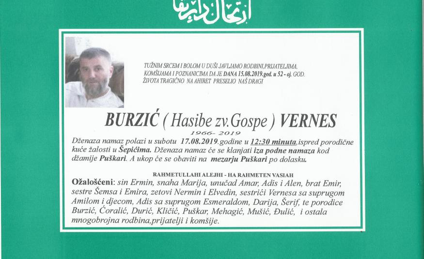 Na Ahiret tragično preselio Burzić (Hasibe zv. Gospe) Vernes