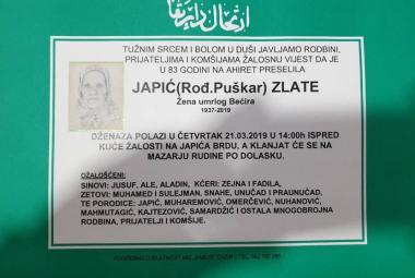 Na Ahiret preselila Japić (rođ.Puškar) Zlate