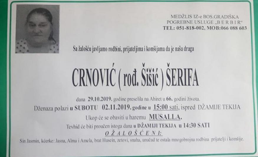 Na Ahiret preselila Crnović (rođ. Šišić) Šerifa