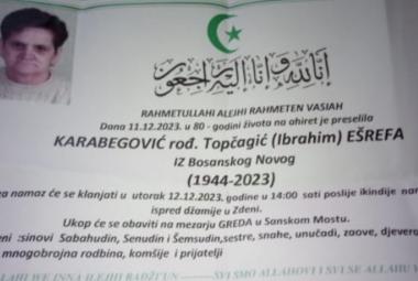 Na Ahiret preselila Karabegović rođ. Topčagić (Ibrahim) Ešrefa