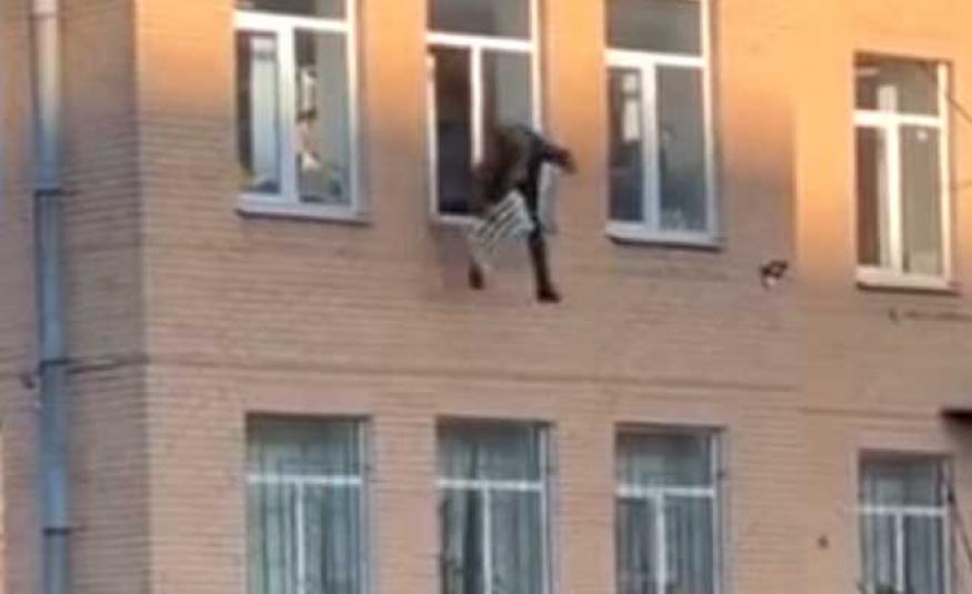 Skočio kroz prozor policijske stanice sa radijatorom u ruci (VIDEO)