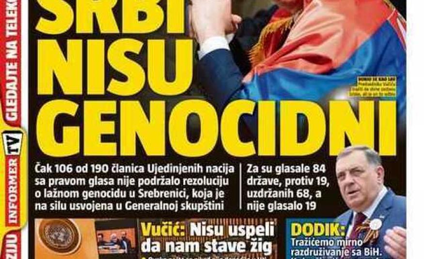 Ovako su tabloidi u Srbiji vidjeli glasanje u UN-u o rezoluciji o genocidu u Srebrenici
