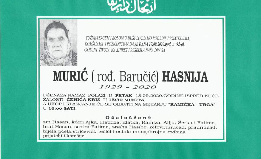 Na Ahiret preselila Murić (rođ. Baručić) Hasnija